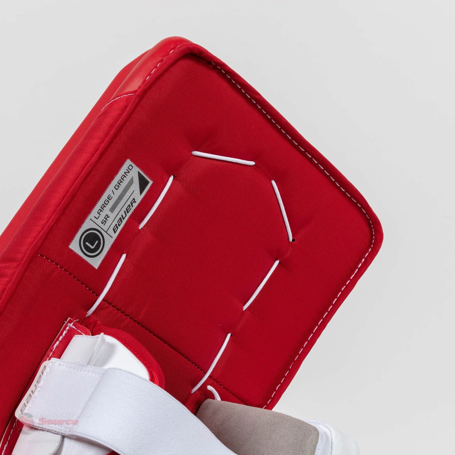 Bauer is continuing with XS, S, M, L, and XL in senior sizing. The Bauer pad sizing is equivalent to the following; XS 32″, Small 33″, Medium 34″, Large 35″, and XL 36″. The stock colours of the Bauer GSX goalie pads are White, Black, Navy, and Red.