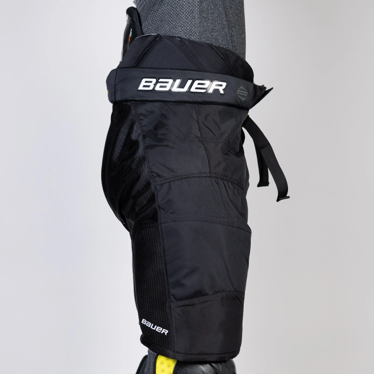 The Bauer Mach hockey pants are constructed using durable 840D nylon material, ensuring long-lasting performance and protection. This robust external material offers excellent resistance against wear and tear, ensuring enhanced durability during intense gameplay. In addition, the pants feature strategically placed mesh panels throughout, promoting optimal airflow and aeration. This design helps to keep players cool and comfortable by allowing ventilation and efficient moisture management.