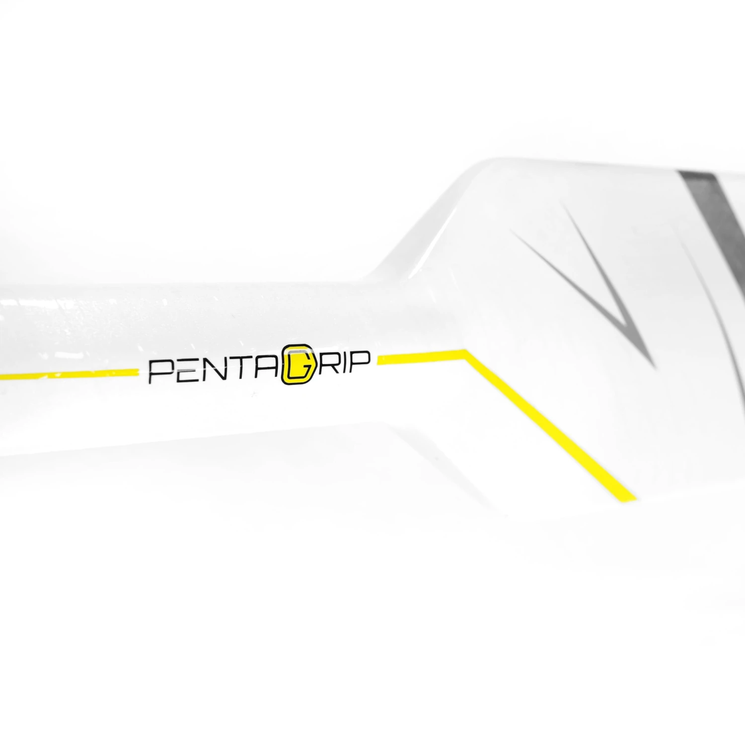 The handle of the Hyperlite features the tacky, textured grip that has been on prior Bauer sticks. However, the Hyperlite utilizes the brand new handle geometry of Pentagrip to further optimize goalies’ grip. As it sounds, Pentagrip is an asymmetrical pentagonal shape of the shaft, only on the front side of where the stick is held. With our hands naturally forming better around less squared-off surfaces, Pentagrip improves the grip of the stick, and gives goalies a better all around feel in the hand.