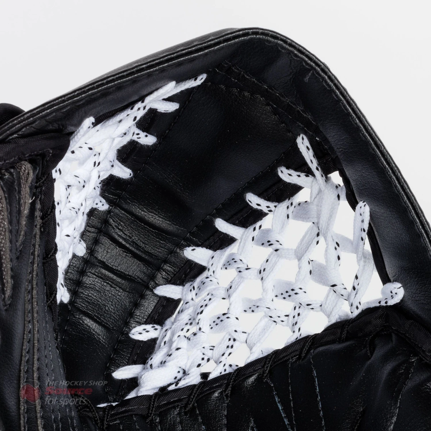 The OPTiK 2 utilizes the BOA System to precisely dial in the tightness of the catcher on the back hand and cuff of the catcher. It also features a velcro adjustable elastic strap sitting above the finger stalls that when tightened allows goalies to close the glove easier while giving the sense that their fingers are locked into the finger stalls. Finally, traditional thumb and pinky finger loops allow for easier closure and a tighter fit.