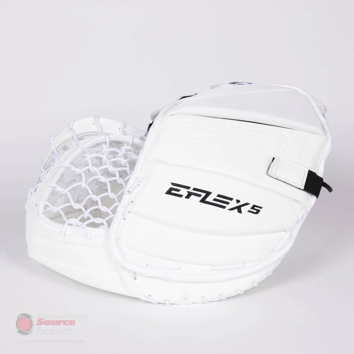 The CCM Extreme Flex 5 Senior Goalie Catcher further advances their 600 degree catch angle gloves, while maintaining the popular design that goalies have come to know and love. The E-Flex 5 is constructed with D30 Smart Foam in the palm, paired with a FlexMotion backhand and cuff which allows for ample protection, while still providing a flexible and customizable fit.