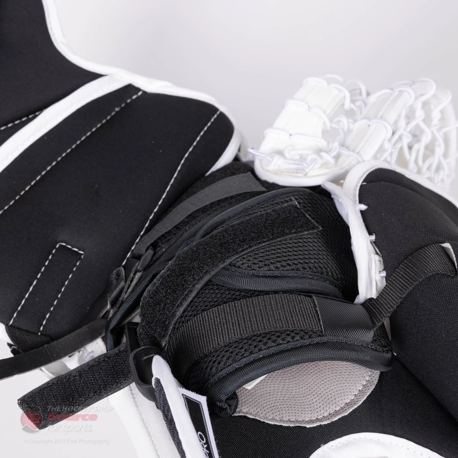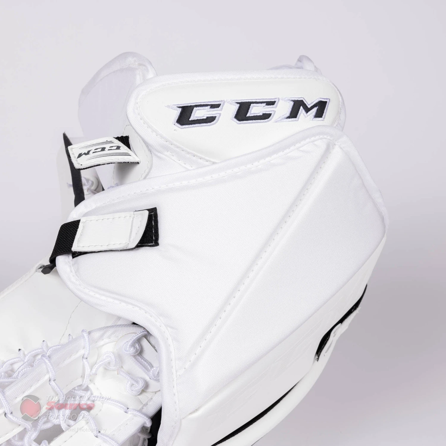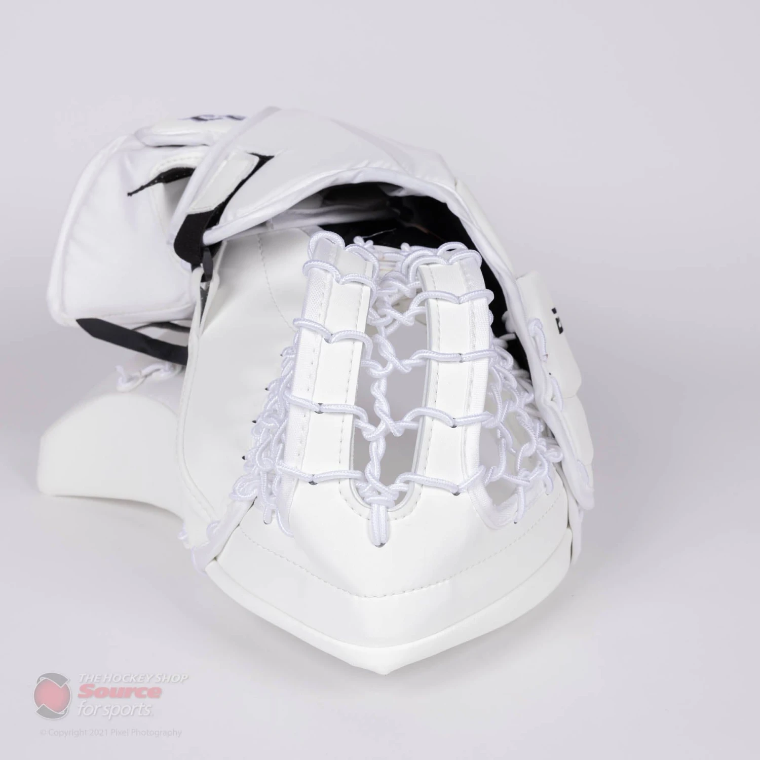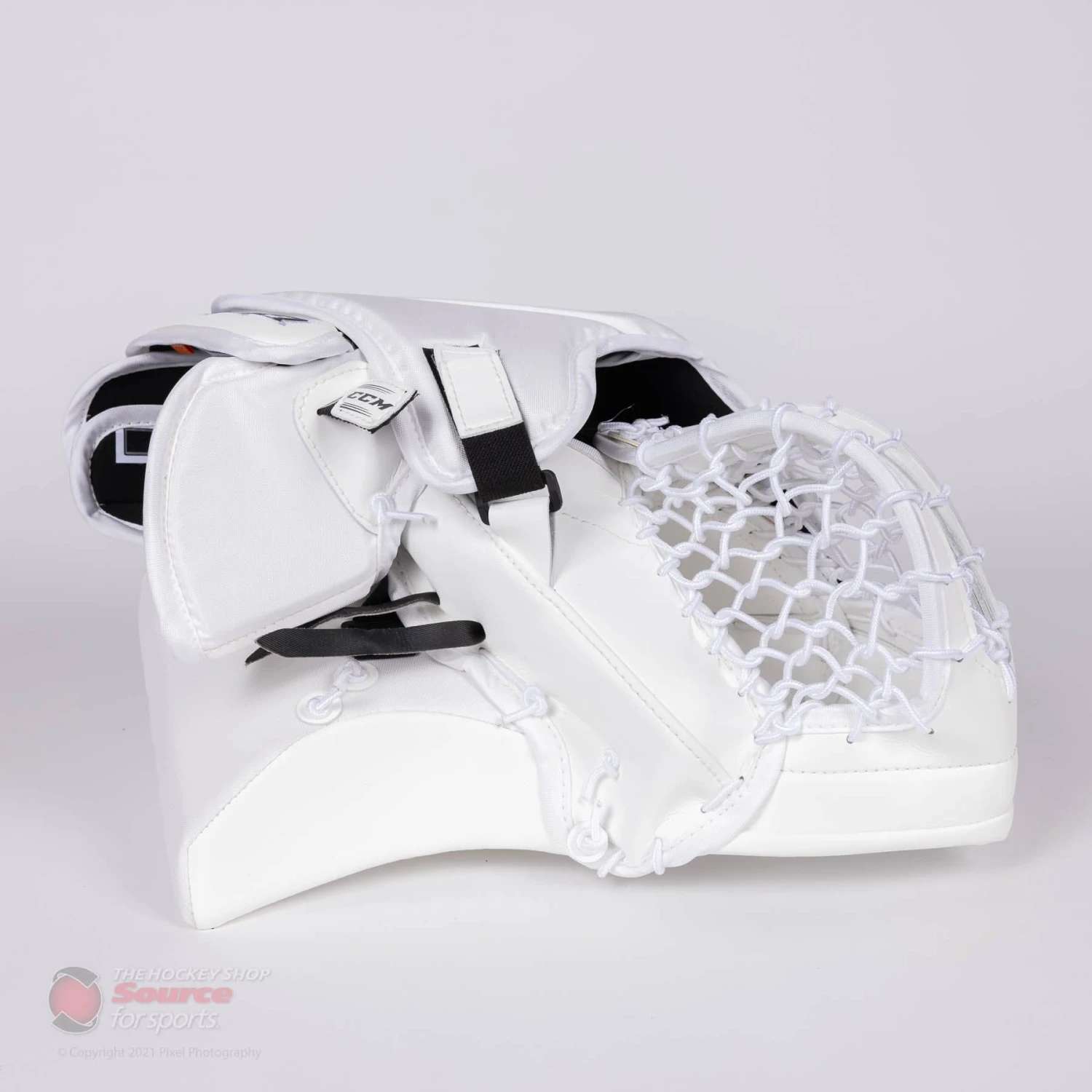 The CCM Extreme Flex 5 Goalie Catcher is available in a range of stock colors, as well as in endless variations through CCM’s customizer. Customizing the CCM EFlex 5 Catcher allows for a variety of colour and spec changes. CCM custom gives you the option to change the break angle to the 580 or 590, both found in the Axis Catcher line. This gives goalies full autonomy of their glove preference, while still being able to have their entire setup with the E-Flex 5 Graphic. For a full list of custom options and availability, please contact one of our customer service specialists for more details.
