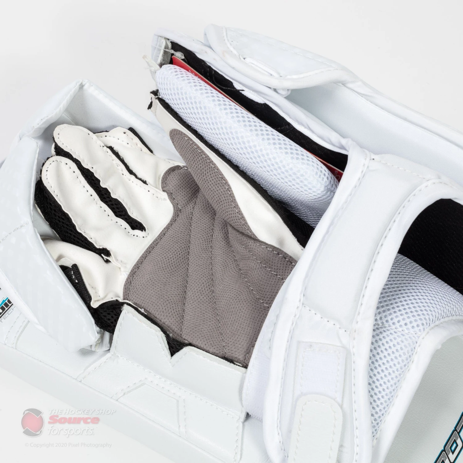 The thumb of the V9 Pro uses a moulded design in order to offer superior protection while the finger guards use a composite core and HD foams. The back of the fingers use thin HD foam padding to catch anything that passes by the large finger protectors. Finally, a large sewn in floating index finger protector sits flush with the stick to catch pucks riding up the paddle.