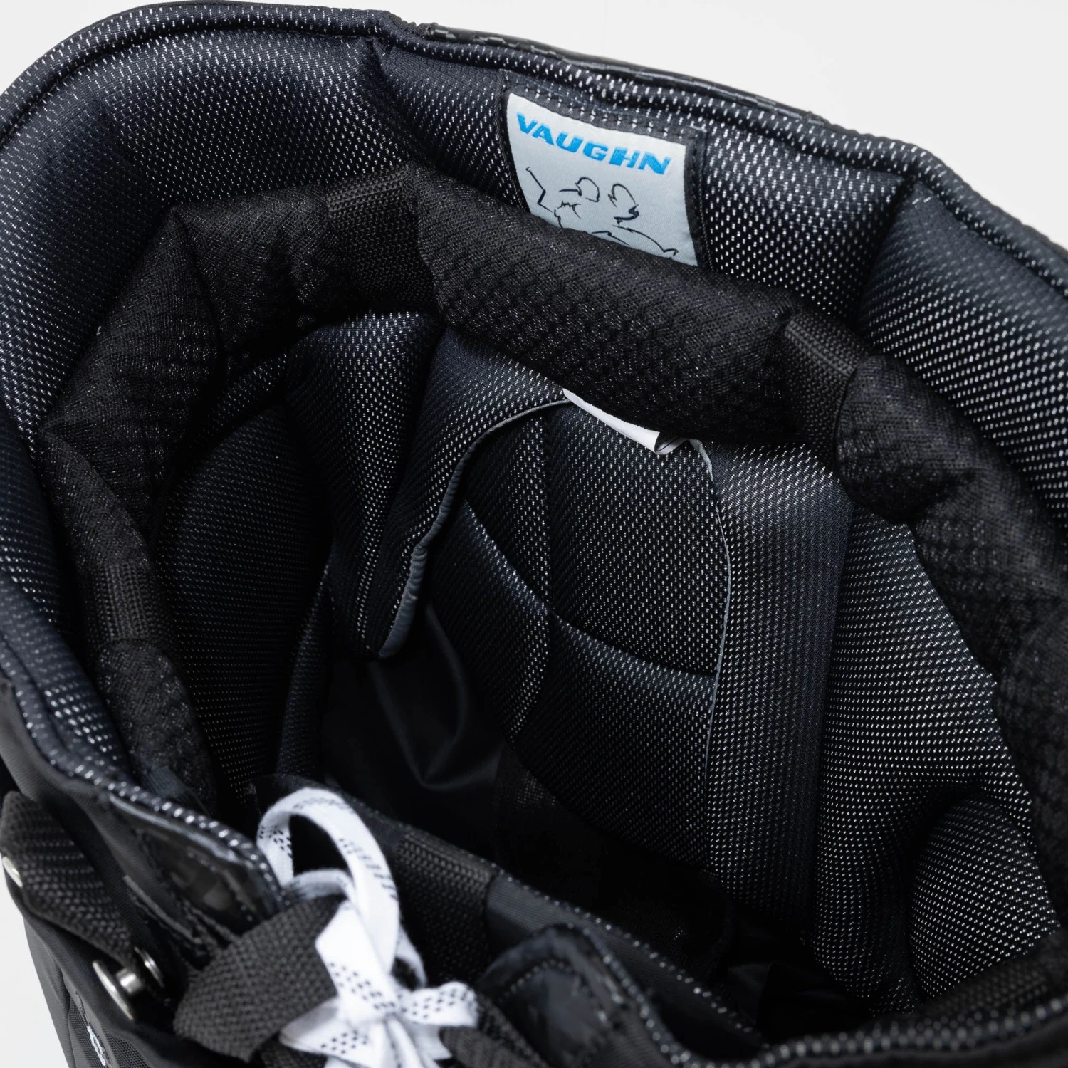 The thigh padding is wide and curved for better net coverage (11” in width). The inner thigh section has been furnished with five-hole padding blockers to cover that area and aid in making those kinds of saves.