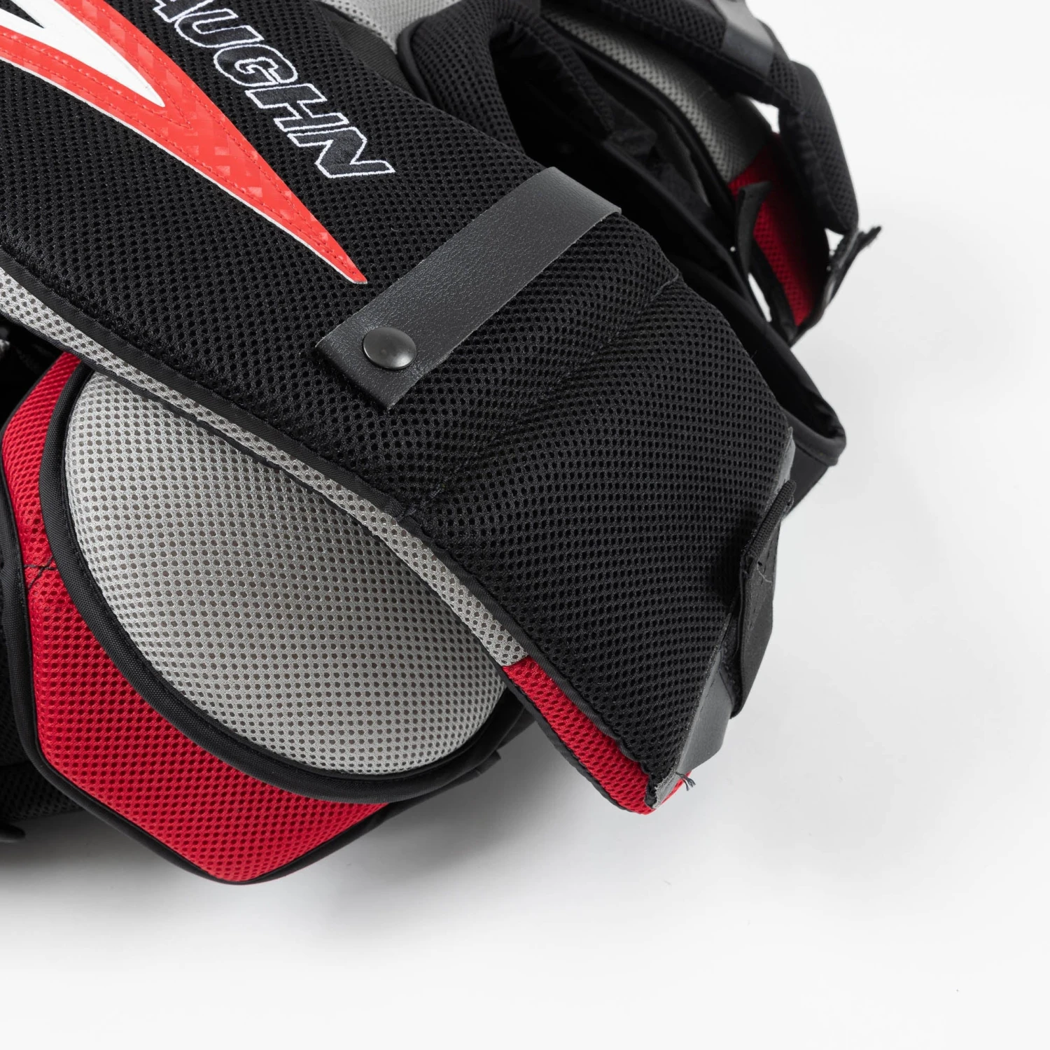 A second optional velcro layer was added under the shoulder floaters; many goalies like to wear this layer during practice and take it off during games for some extra range of motion.